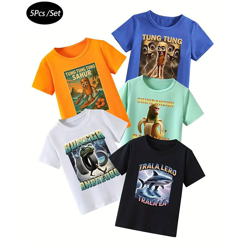 5pcs Boys' Summer Short Sleeve T-Shirts Casual Round Neck Tops in Assorted Colors Playful Graphic Tee Design Comfortable Fit Shirt - Crocodile Cappuccino Tral Shark Dong Dong Coconut Elephant
