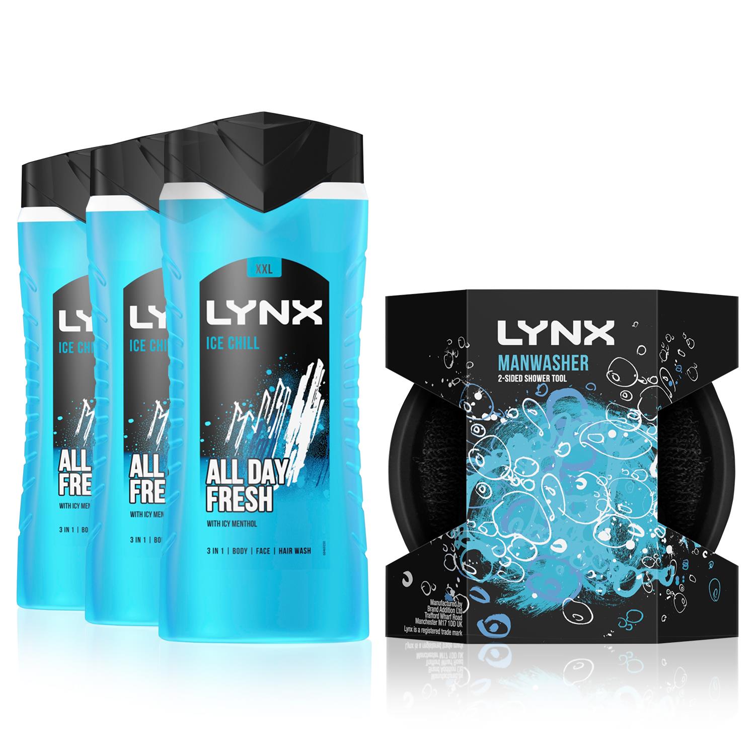 Lynx Mens 3x Ice Chill All Day Fresh 3in1 Showergel 500 ml With Manwasher Showertool - One Size | Lynx Sale | Discount Designer Brands