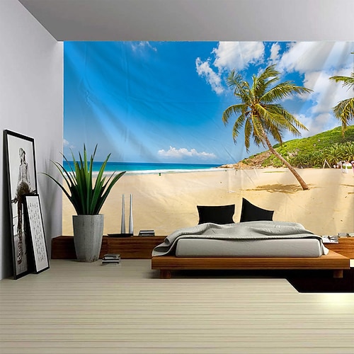Arazzo con paesaggio tropicale di spiaggia e palme da cocco, ideale da appendere in camera da letto, soggiorno, dormitorio, stanza universitaria o per decorare la casa, con sfondo fotografico.
