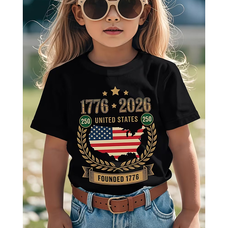 100% Cotton Kids Girls' Black Graphic USA Flag 250th Anniversary Kid's American US Flag T shirt Tee Crew Neck Short Sleeve Vacation Sports Outdoor Dailywear Active Vacation Casual Printing Summer