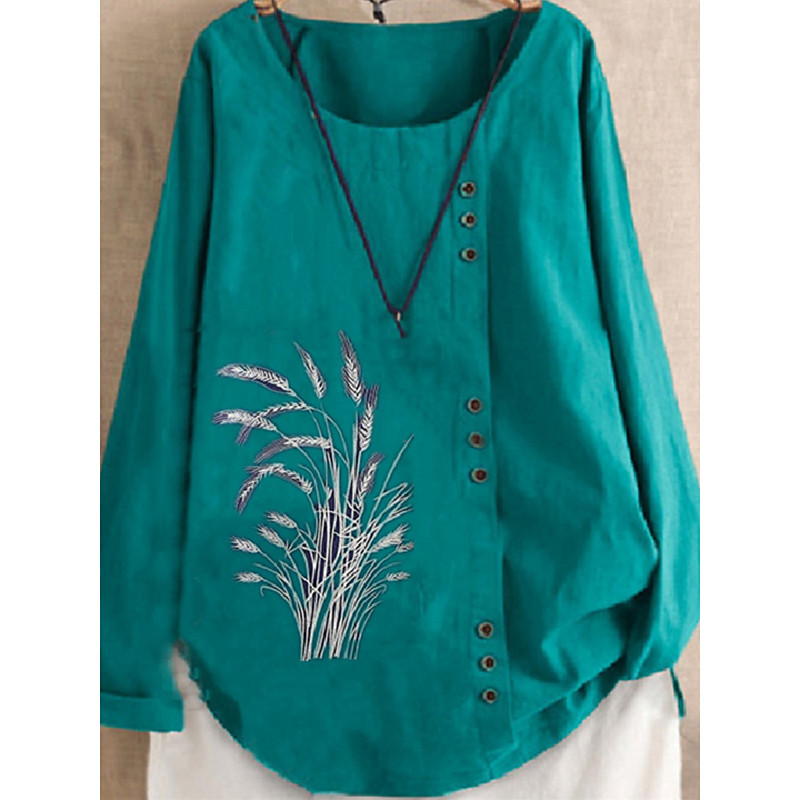Women's Cotton Linen Shirts Floral Basic Casual Long Sleeve Crew Neck Regular Tops Daily Embroidered Buttons Navy Blue Green Light Blue Summer Fall
