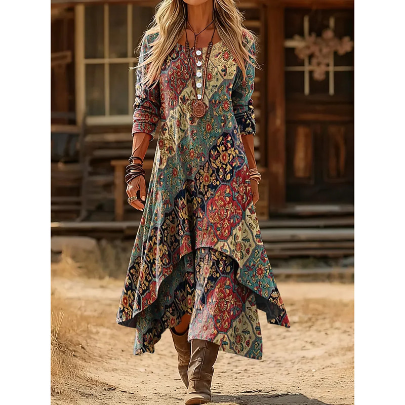 Women's Midi Dress Shift Dress Vacation Casual Boho Daily Holiday Regular Fit Floral Graphic Long Sleeve Crew Neck Red Green Fall Winter