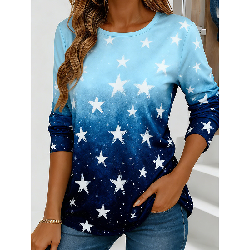New Year Women's T Shirt Ombre Graphic Star Stylish Casual Long Sleeve Crew Neck Regular Tops Daily Weekend Print Blue Summer Spring Fall