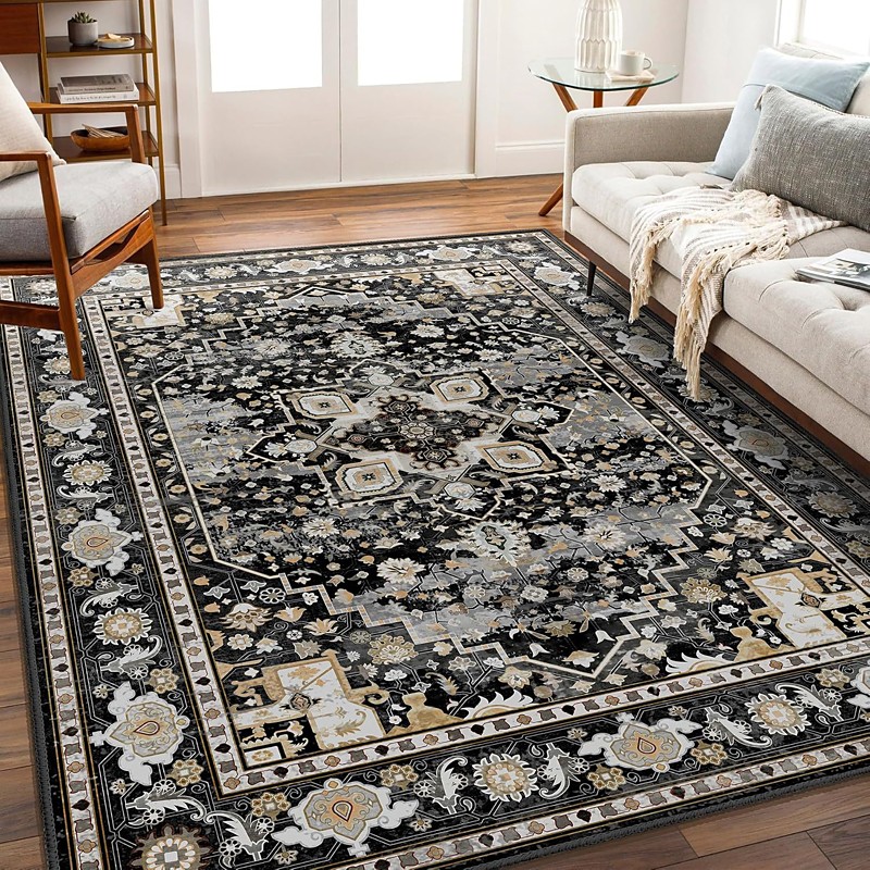 Area Rugs For Living Room And Bedroom Large Stain Resistant Washable Soft Non-Slip Vintage Floral Oushak Carpet Boho Moody Farmhouse Style Sofa Bedside Home Decor Black Brown