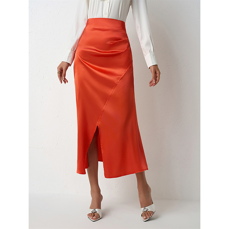 Women's Satin Skirts Elegant Vintage Fashion Casual Midi High Waist Skirts Plain Ruched Patchwork Split Ends Inelastic Daily Office / Career Black Champagne Orange Green Summer Satin Polyester