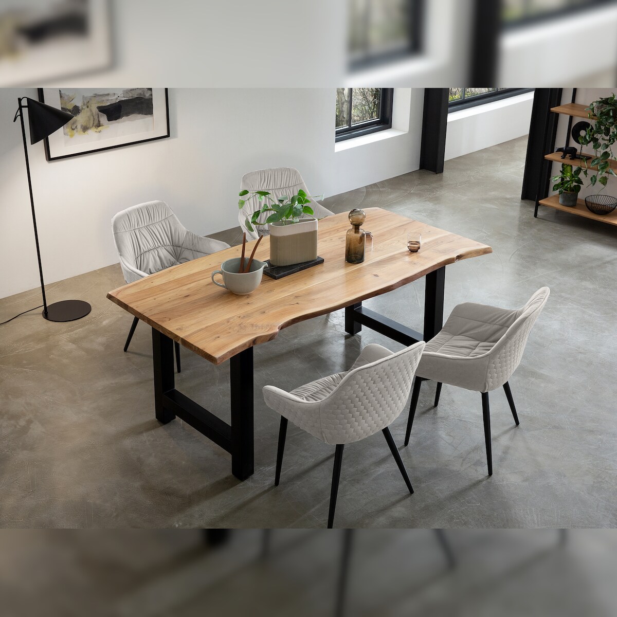 SalesFever Tischgruppe 160 x 85 cm | 5-tlg. | 35 mm Platte Akazie natur | H-Gestell Metall schwarz | 4 Stühle aus Samt | creme – schwarz