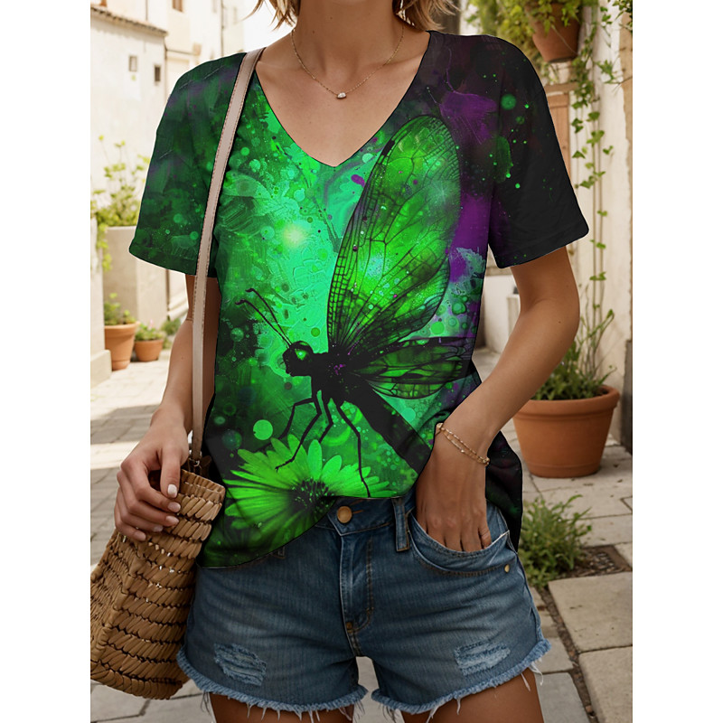 Women's T Shirt Graphic Animal Dragonfly Vintage Stylish Classic Short Sleeve V Neck Regular Tops Daily Going out Weekend Print Black Red Blue Purple Green Summer Spring