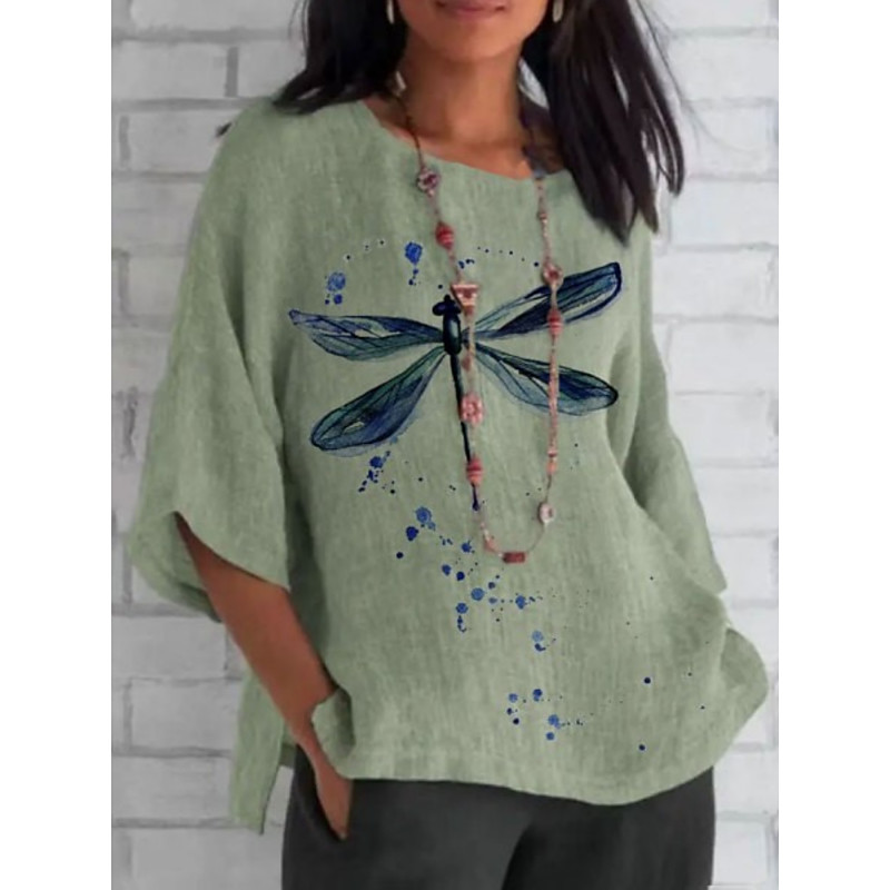 Women's Shirt Dragonfly Daily Casual 3/4 Length Sleeve Crew Neck Regular Tops Daily Holiday Print White Blue Green Summer Spring Fall