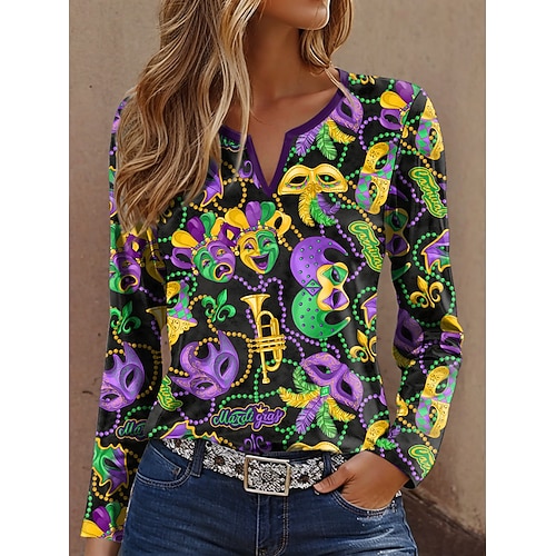 Maglietta da donna Carnival Graphic Fashion Casual a maniche lunghe colletto rotondo top regolari stampa quotidiana fine settimana blu nero viola estate primavera autunno