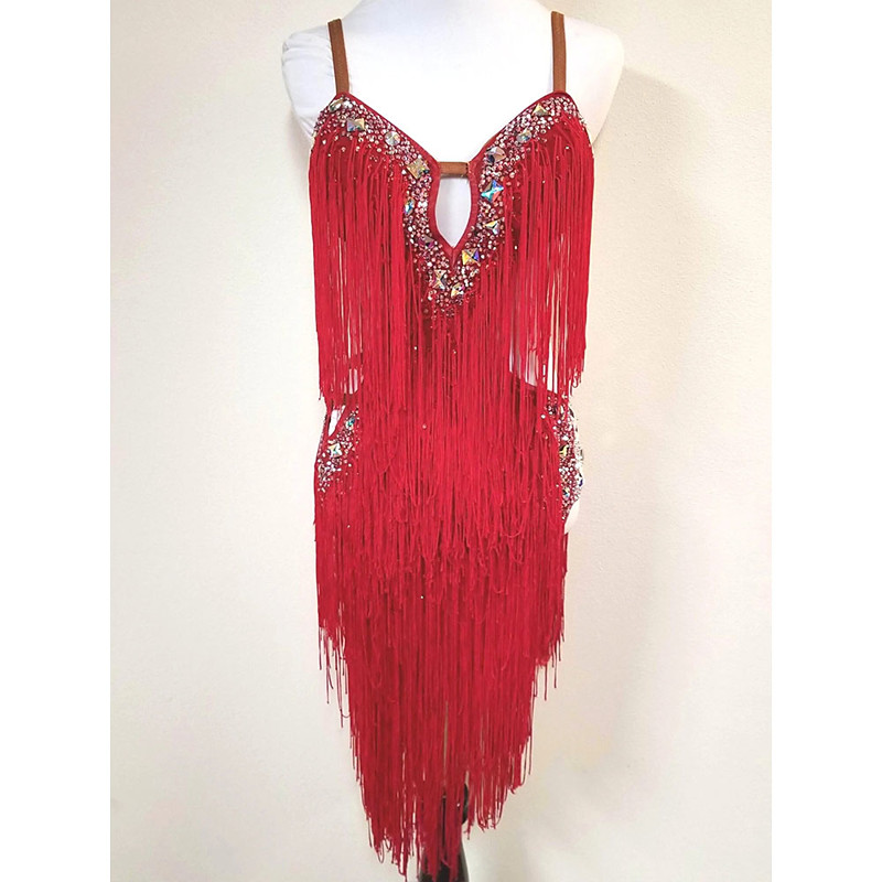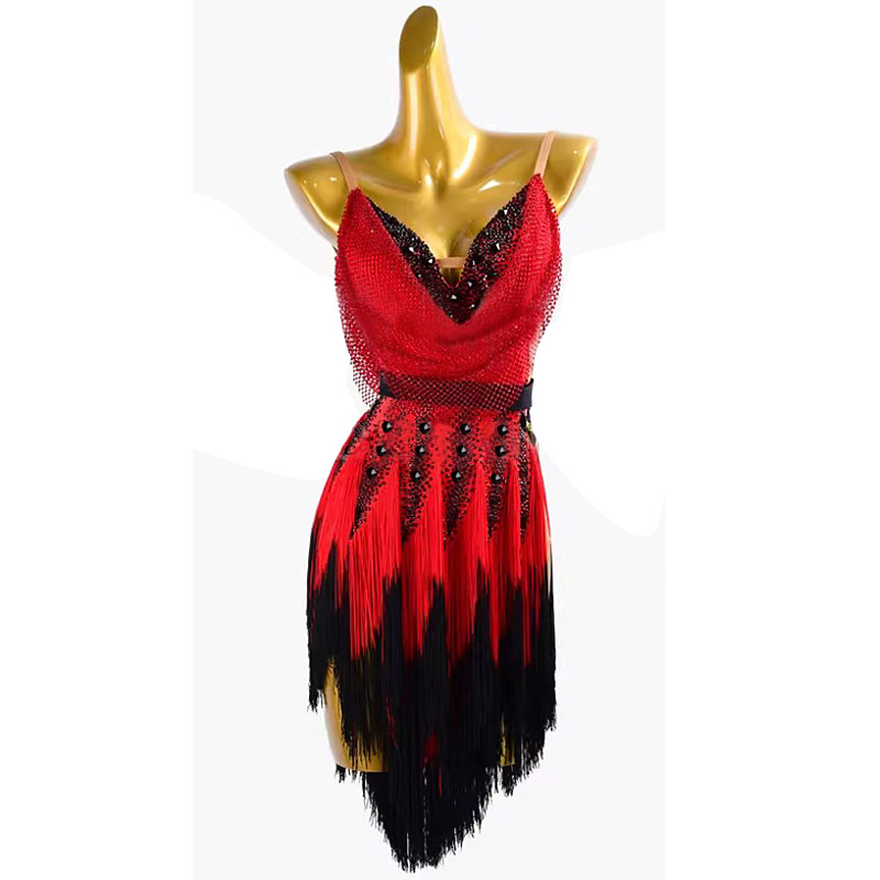 Women's Latin Dance Dress Red Fringe Rhinestone Deep V Competition Performance Costume for Cha Cha Samba Rumba Jive