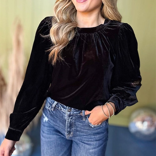 Per donna Camicia Blusa con texture Top estivi Semplice Quotidiano Elegante Essenziale Manica Lunga Manica a Lanterna Girocollo Top Regolari Lavoro Quotidiano Ferie Arricciato Nero Vino Blu Primavera