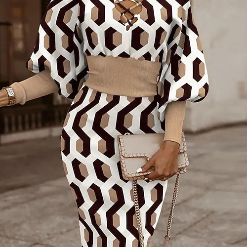 Per donna Abito Midi Vestito Casual Abito Stampato Elegante Moda Moderno Quotidiano Feste Uscire Vestibilità regolare Grafico Blocco di colori Manica Lunga Scollo a V Bianco e nero Nero Bianco Rosso