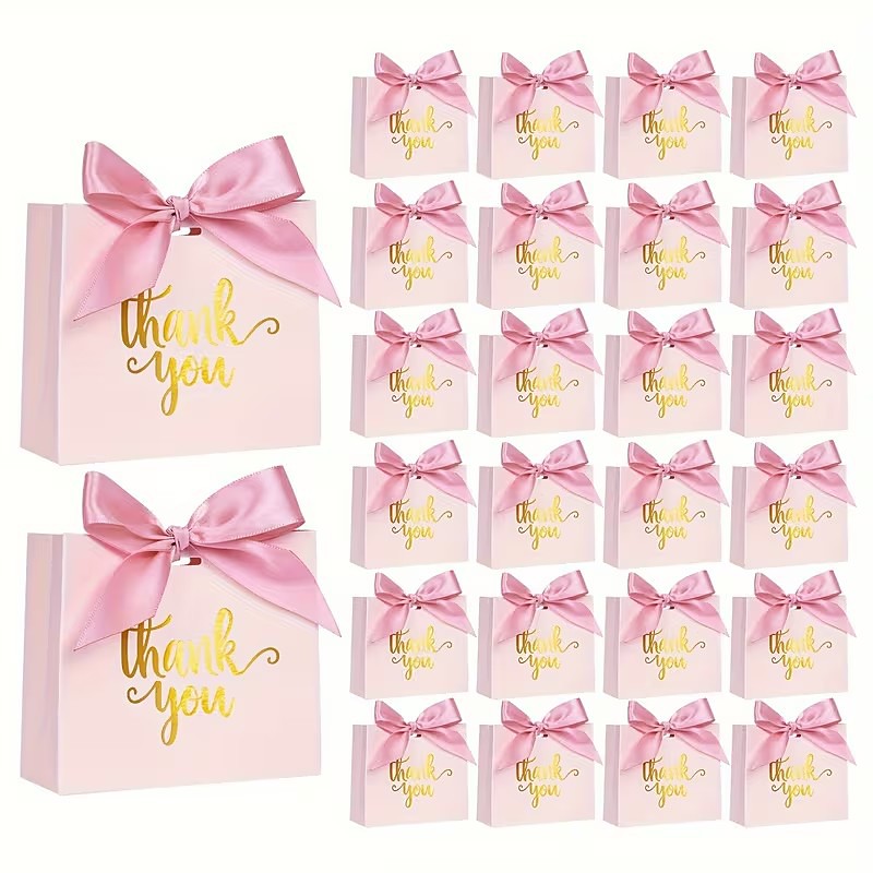 24PCS Valentine's Day Pink Gift Bags with Thank You Tags and Bow Ribbons, Party Favor Bags for Wedding, Bridal Shower, Bridesmaids, Mother's Day, Birthday, Baby Shower