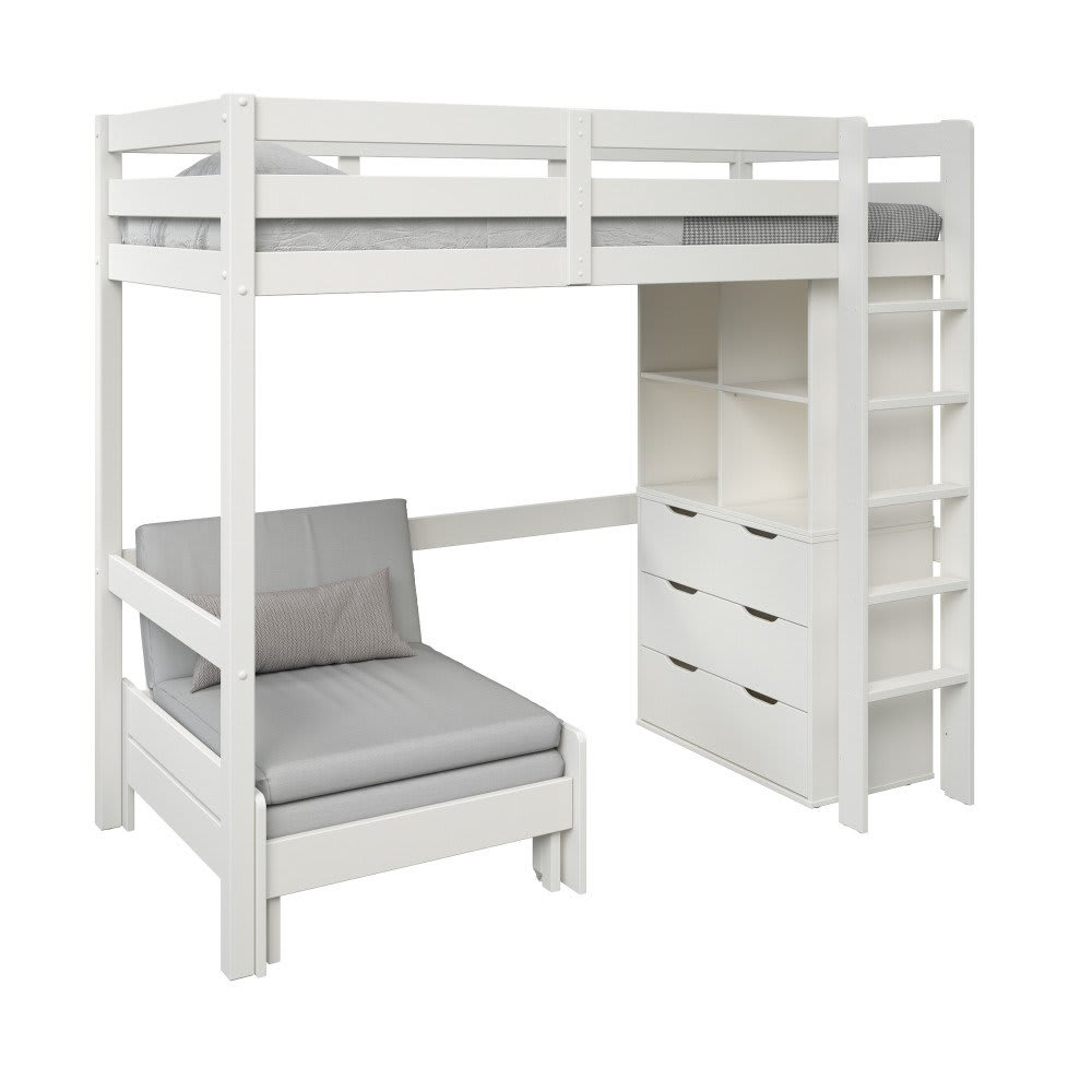 Letto a soppalco in pino bianco 90x190 con contenitore e poltrona