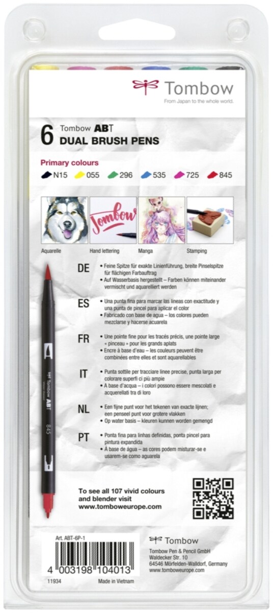 Tombow Dual-Fasermaler ABT mit Rundspitze/Pinselspitze Wasserbasis Primärfarben VE=6x6 Stück