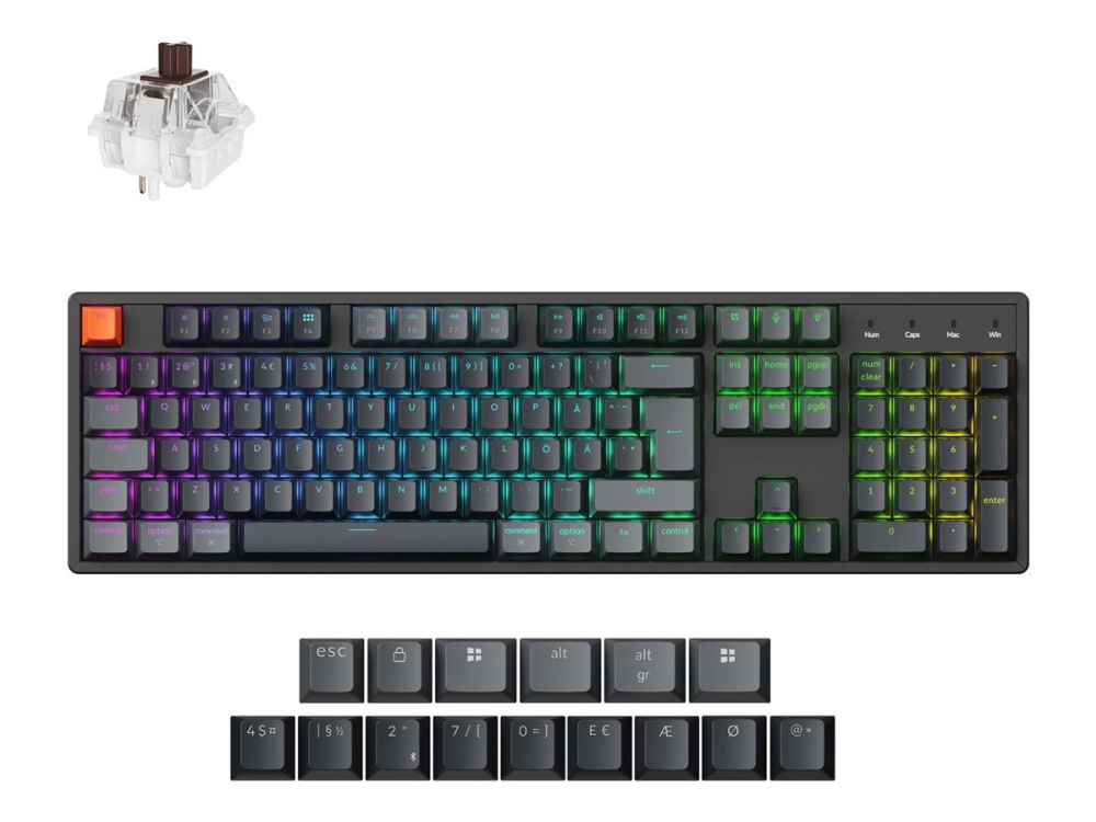Keychron K10 - Version 2 - tastatur - ISO layout, QMK , mechanical - 100% - full size - bakgrunnsbelyst - trådløs - USB-C, Bluetooth 5.2 - QWERTY - Nordisk - tastsvitsj: Keychron Super Brown (Hot-swappable)