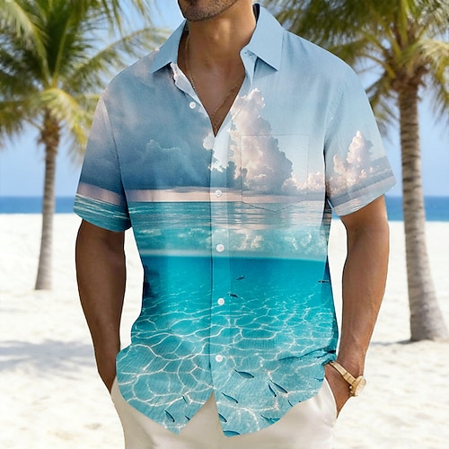 Per uomo Oceano Paesaggio Mare Camicia Camicie hawaiane Camicia Aloha Manica Corta Hawaiano Vacanza Ferie Estate Collo ripiegato Stampa 3D Una tasca anteriore Camicia tipo lino Blu Blu chiaro