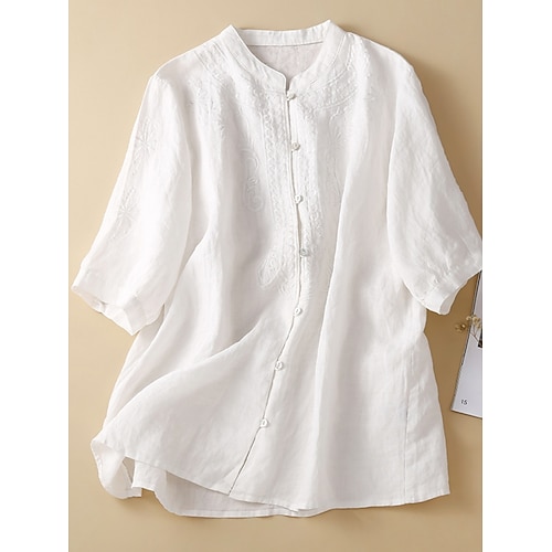 Per donna Blusa Tinta unica Elegante Essenziale Casual Manica Lunga Collo Alto Top Regolari Quotidiano Ricamato Bottoni Bianco Blu marino Estate Primavera