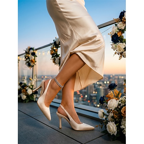 scarpe eleganti con tacco a spillo in raso color champagne da donna, con cinturino alla caviglia e punta affilata, per gli invitati ai matrimoni in chiesa