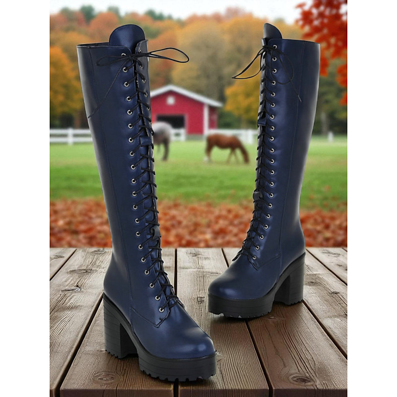 Women's Black Platform Knee-High Lace-Up Boots - Faux Leather Chunky Heel Gothic Boots for Fall Winter Streetwear , Daily Outfits and Halloween Fashion