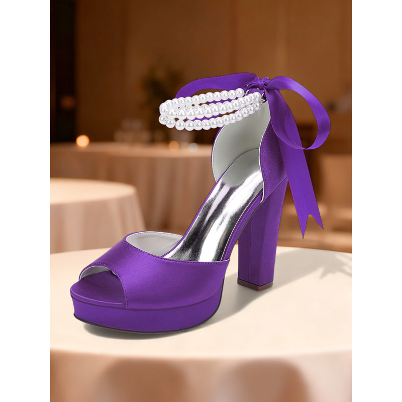 Women's Purple Satin Platform High Heel Sandals with Pearl Ankle Strap - Glamorous Open Toe Party Shoes for Evening, Wedding and Cocktail Events