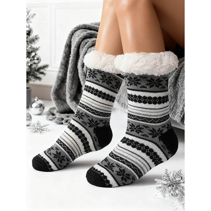 Men's Christmas Fuzzy Knit Floor Socks, Warm Red and Black Snowflake Pattern Home Slipper Socks with Soft Plush Lining for Holiday Party Winter Indoor Wear