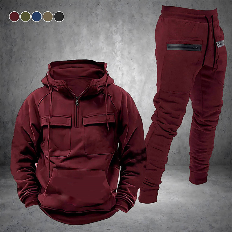 Men's Hoodie Tracksuit Sweatsuit Quarter Zip Hoodie Black Wine Navy Blue Hooded Plain Drawstring 2 Piece Front Pocket Sports Outdoor Daily Holiday Polyester Streetwear Basic Casual Fall Winter