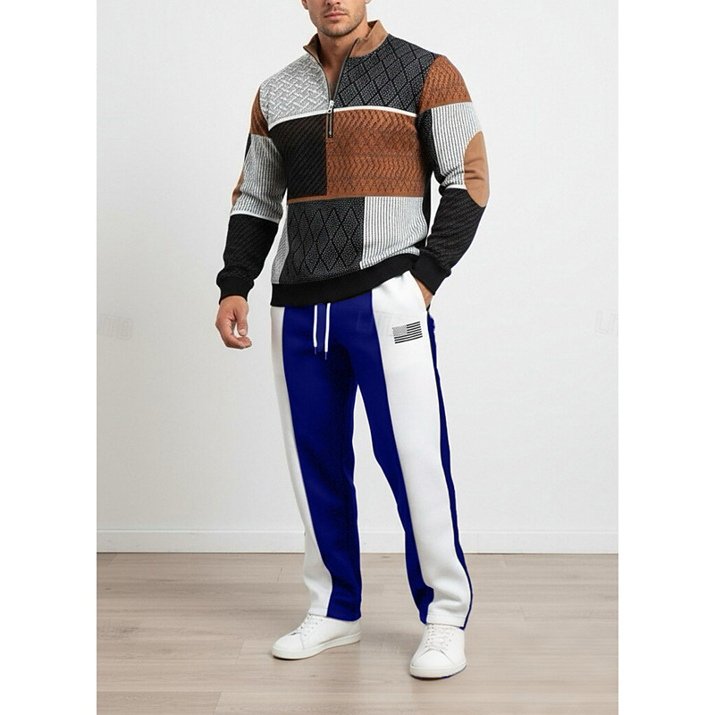 Men's Checkered Geometrical 2pcs 3D Sweatshirt Sets Tracksuit Zip Up Sweatshirts Long Sleeve Long pants Stand Collar Sporty Outdoor Vacation Athletic Printed Zip Up Spring Fall Lake blue Blue Brown