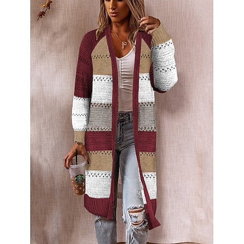 Damen Pullover Strickjacke Elegant Mode Streetwear Gestreift Öffnung vorne Tasche Gestrickt Langarm Lange Oberteile Stricken Outdoor Täglich Wochenende Schwarz Wein Frühling Herbst