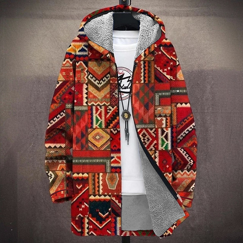 Men's Geometric Winter Coat Fleece Jacket Coat Thermal Warm Comfortable Casual Daily Wear Zipper Pocket 3D Print Fall Winter Hooded Long Sleeve White Red Brown