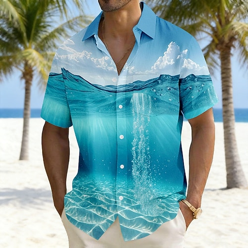 Per uomo Oceano Paesaggio Mare Camicia Camicie hawaiane Camicia Aloha Manica Corta Hawaiano Vacanza Ferie Estate Collo ripiegato Stampa 3D Una tasca anteriore Camicia tipo lino Blu Blu chiaro