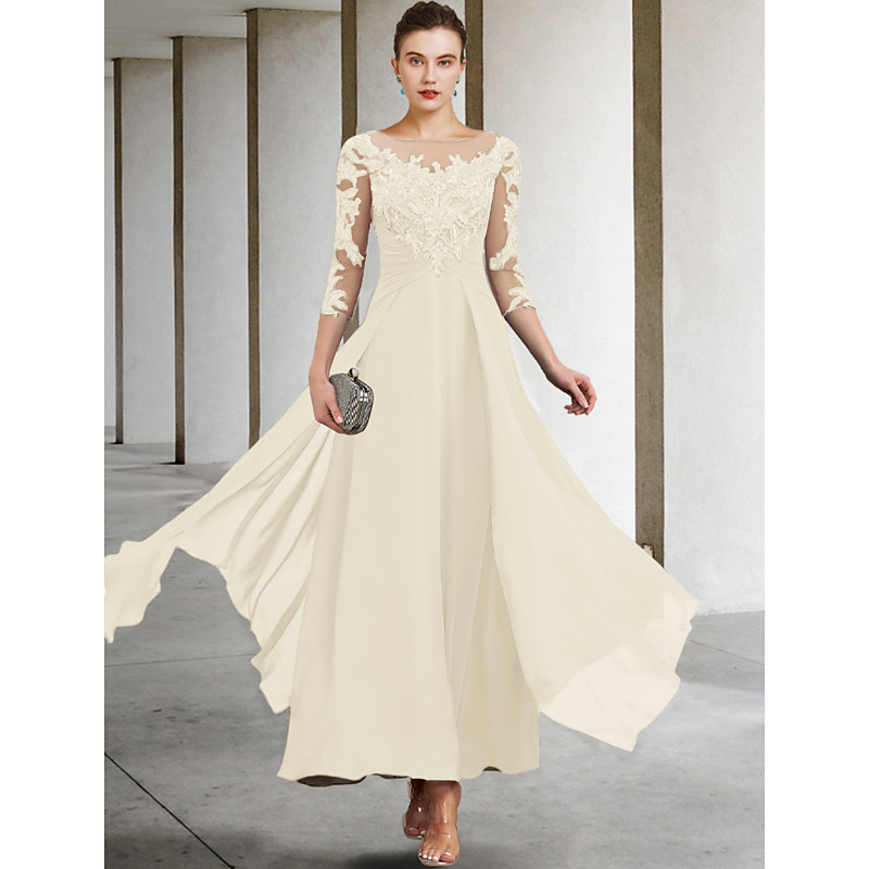 A-Line Ankle Length Party Dress Cocktail Dress Wedding Guest Dress Mother of the Bride Dress 3/4 Length Sleeve Jewel Neck Elegant Plus Size Wedding Guest Wedding Party Chiffon Lace with Ruched Sequin
