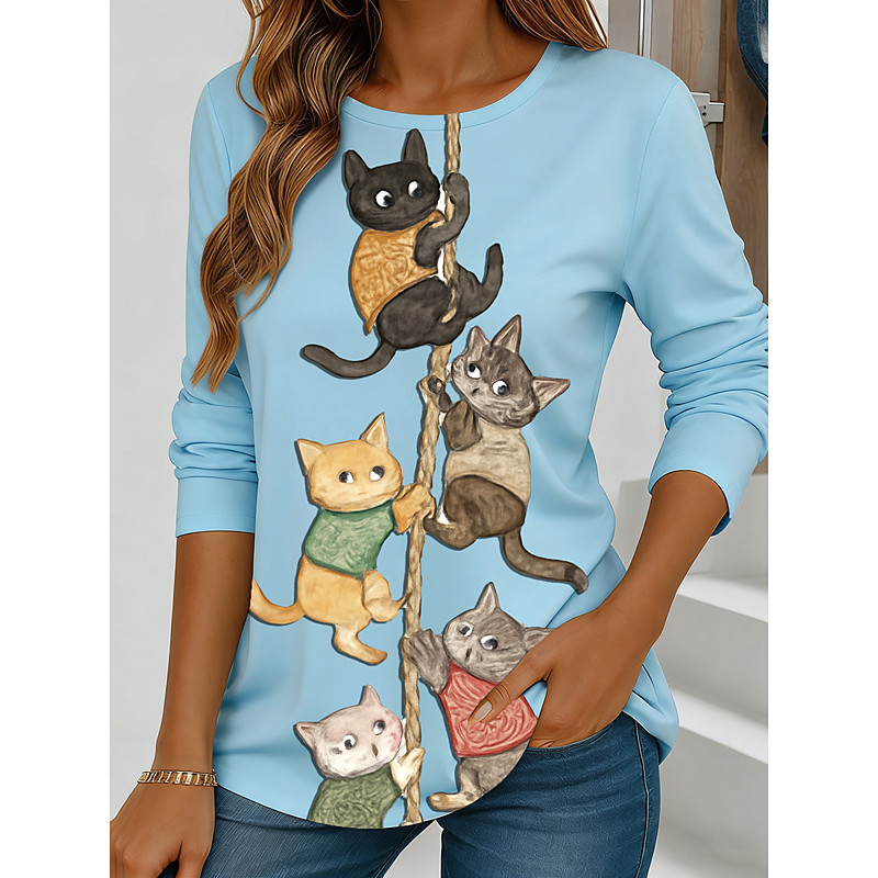 Women's T Shirt Graphic Animal Cat Fashion Stylish Casual Long Sleeve Crew Neck Regular Tops Daily Weekend Print Blue Summer Spring Fall