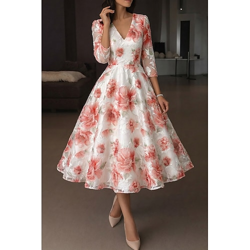 Linea ad A Lunghezza alla caviglia Lunghezza Tè Abito Formale Abiti da Cocktail Elegante Manica 3/4 Scollo a V Matrimonio Formale Organza Jacquard con Stampa floreale