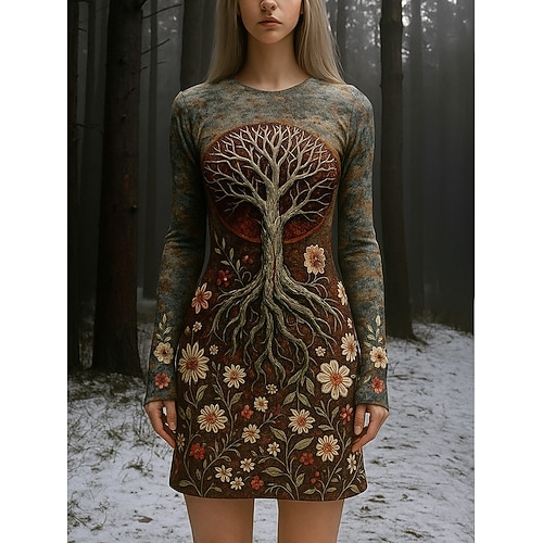 Vestito corto da donna vichingo boho vintage albero della vita vestito t-shirt vestito tubino vacanza casual festa appuntamento vestibilità regolare grafico manica lunga girocollo verde primavera