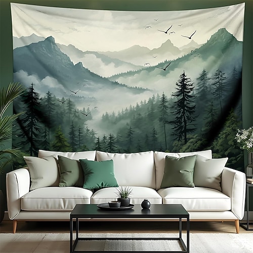 Arazzo da parete con paesaggio montano e foresta nebbiosa, pini e inchiostro, dipinto su tela, minimalista, grigio, nero e bianco, arte naturalistica per soggiorno, ufficio, camera da letto,