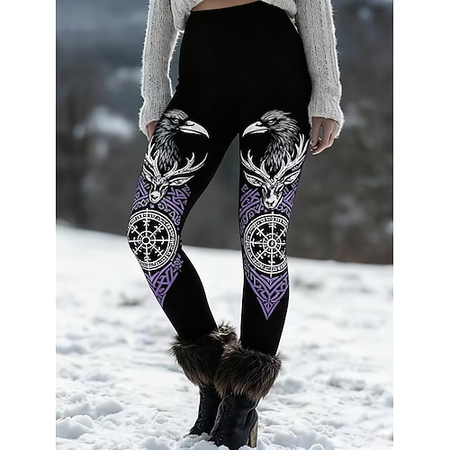 Damen-Leggings im Wikinger-Stil, kuschelig, für Urlaub, Vintage-Look, Ethno-Stil, lange Länge, hoher Bund, Grafikprint, bequem, dehnbar, lässig, für Alltag und Freizeit, lila, Frühling/Herbst, schmale