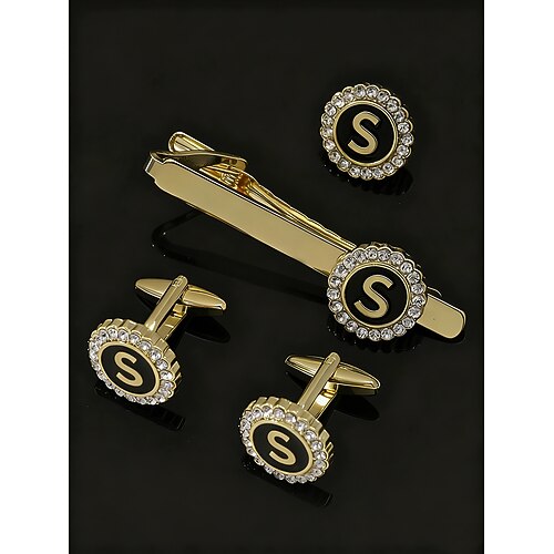 set di fermacravatta, gemelli e spilla da bavero in lega da uomo: elegante design nero e oro con dettagli in cristallo, personalizzato con 26 iniziali, regalo perfetto per eventi formali e abbigliamento da lavoro