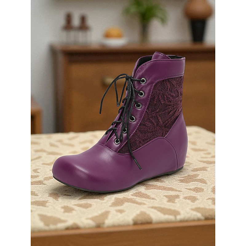 Women's Brown Faux Leather Fabric Hidden Wedge Lace-Up Ankle Boots, 1950s Vintage Shoes for Retro Outfits, Cosplay Daily Wear