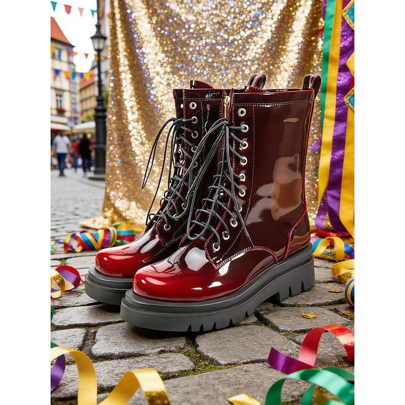 Women's Mardi Gras Blue Patent Leather Combat Boots with Chunky Sole and Lace-Up Design – Bold Footwear for Carnival, Festivals and Casual Outings