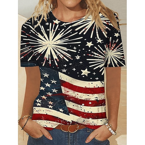 Unabhängigkeitstag Patriotische Damen T-Shirt Druck Grafik Flagge Stilvoll Klassisch Leger Kurzarm Crewneck Rundhals Reguläre Oberteile Täglicher Druck Blau Marineblau Rot Blau Sommer Frühling