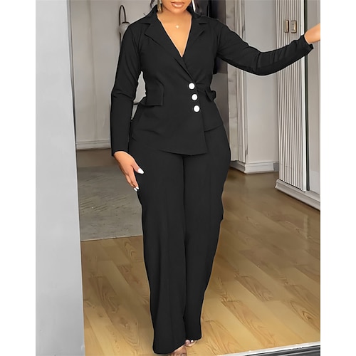 Per donna Tuta Attivo Tinta unica Manica Lunga Zampa di elefante Colletto a Camicia Tasca Con Cintura Vacanza Quotidiano Vestibilità regolare Nero Bianco Vino Primavera