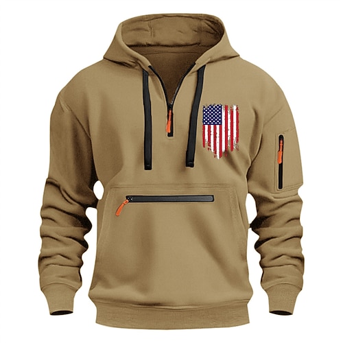Per uomo Felpa con cappuccio Maglione Felpa con cappuccio e zip corta Blu Nero Vino Blu marino Cammello Con Cappuccio Bandiera Americana Tasca Stampato Quotidiano Sport Outdoor Ferie Streetwear