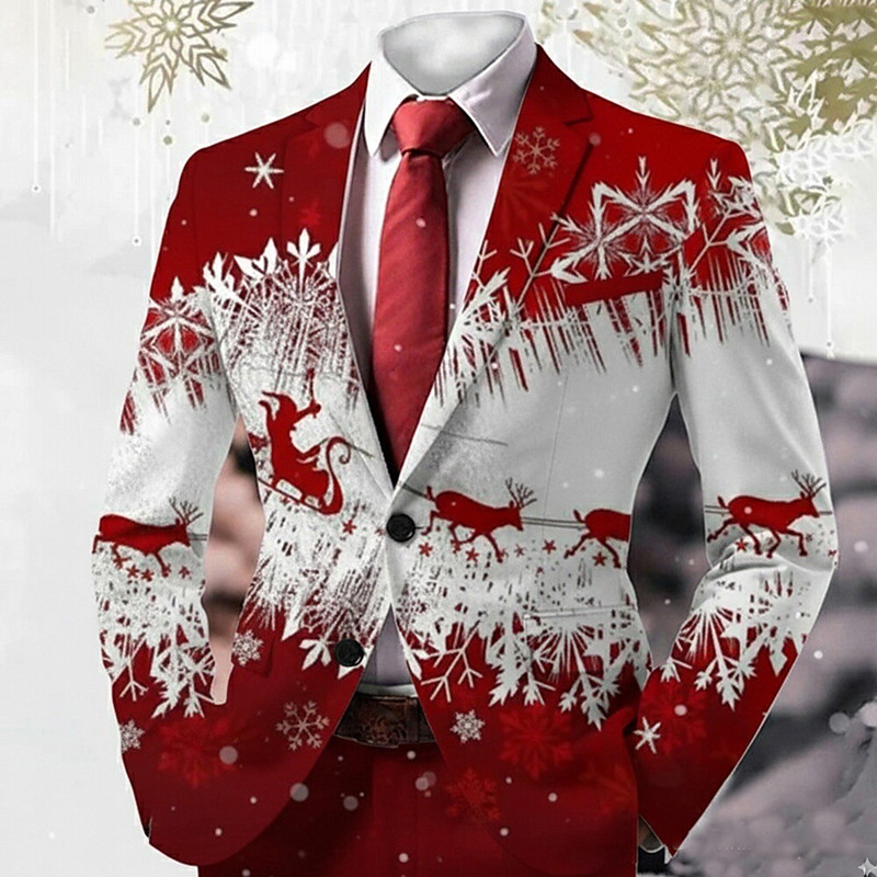 Men's Blazer Coat Christmas Outdoor Casual Casual Daily British Fall / Winter 100% Polyester Elk Snowflake 3D Print Buttons Thermal Warm Comfortable Single Breasted Blazer Red Blue Green