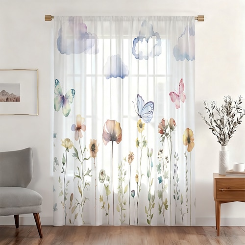 Tenda trasparente per tutte le stagioni, ideale per camera da letto e soggiorno, con motivo di glicine e tralci, elegante decorazione floreale con passante per asta, per un arredamento delicato e