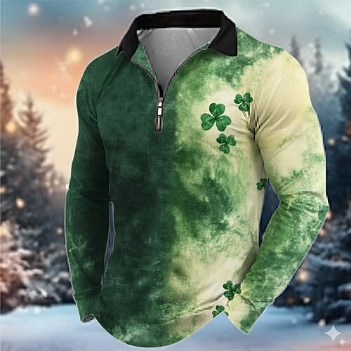 San Patrizio Per uomo Trifoglio Polo Manica Lunga Collo ripiegato Moderno Tempo libero Athleisure Casual Quotidiano Festival Cerniera Stampa 3D Primavera Autunno Nero Bianco Verde