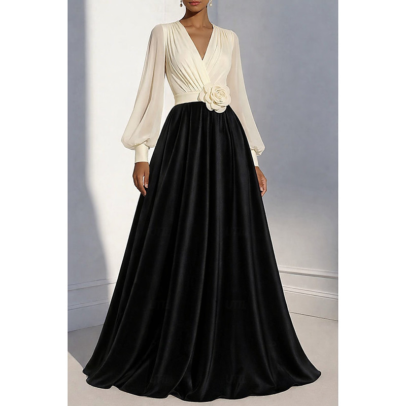 A-Line Floor Length Evening Gown Ball Gown Formal Dress Elegant Color Block Silky Long Sleeve V Neck Wedding Formal Pocket Chiffon Satin with Embroidered Flower