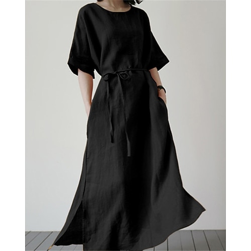 Per donna Abito Midi Abito in cotone e lino Classico Moderno Vacanza Quotidiano Ferie Vestibilità regolare Semplice Manica Corta Girocollo Nero Giallo Verde Estate