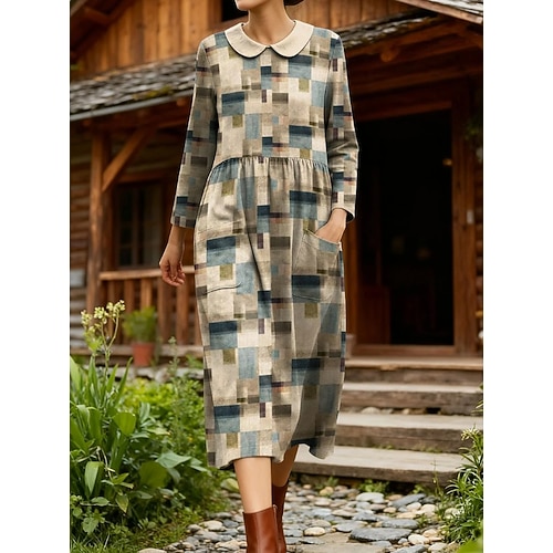Per donna Abito Midi Tubino Abito Pieghettato Vacanza Casual Boho Ferie Abito Primaverile Vestibilità regolare Plaid Astratto Manica Lunga Girocollo Blu Marrone Scuro Marrone Verde Primavera Autunno