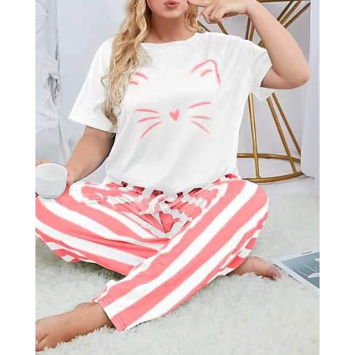 Per donna Attivo Blusa Set di Pantaloni Manica Corta Girocollo Gatto A righe Stampato Vacanza Casual Quotidiano Nero Giallo Rosa Autunno Vestibilità regolare